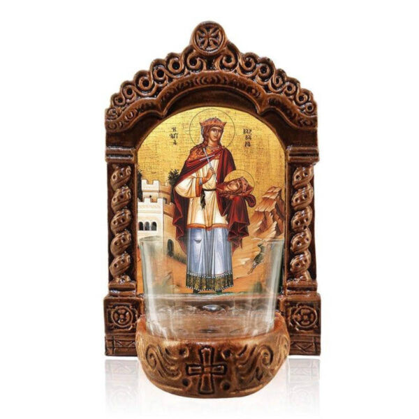 Αυτή η εξαιρετική κεραμική λάμπα αγρυπνίας με την Αγία Βαρβάρα είναι ένα εκπληκτικό κομμάτι χειροποίητης τέχνης. Σχεδιασμένο για να μοιάζει με τρούλο εκκλησίας, περιλαμβάνει λεπτομερείς περιστρεφόμενες στήλες που οδηγούν σε μια περίτεχνη κορυφή με τρούλο. Στο κέντρο του, μια βυζαντινή λιθογραφία της Αγίας Βαρβάρας υπερηφανεύεται για τη θέση του, ενώ στη βάση υπάρχει ένα κηροπήγιο στολισμένο με εγχάρακτο σταυρό.