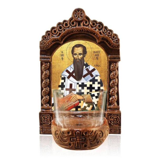 Αυτό το εξαιρετικό κεραμικό φωτιστικό αγρυπνίας με τον Άγιο Βασίλειο είναι ένα εκπληκτικό κομμάτι χειροποίητης τέχνης. Σχεδιασμένο για να μοιάζει με τρούλο εκκλησίας, περιλαμβάνει λεπτομερείς περιστρεφόμενες στήλες που οδηγούν σε μια περίτεχνη κορυφή με τρούλο. Στο κέντρο του, μια βυζαντινή λιθογραφία του Αγίου Βασιλείου υπερηφανεύεται για τη θέση του, ενώ στη βάση υπάρχει ένα κηροπήγιο στολισμένο με εγχάρακτο σταυρό.
