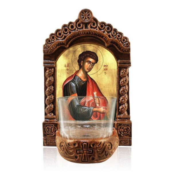 Αυτή η εξαιρετική κεραμική λάμπα αγρυπνίας με τον Άγιο Θωμά είναι ένα εκπληκτικό κομμάτι χειροποίητης τέχνης. Σχεδιασμένο για να μοιάζει με τρούλο εκκλησίας, περιλαμβάνει λεπτομερείς περιστρεφόμενες στήλες που οδηγούν σε μια περίτεχνη κορυφή με τρούλο. Στο κέντρο του, μια βυζαντινή λιθογραφία του Αγίου Θωμά υπερηφανεύεται για τη θέση του, ενώ στη βάση υπάρχει ένα κηροπήγιο στολισμένο με εγχάρακτο σταυρό.