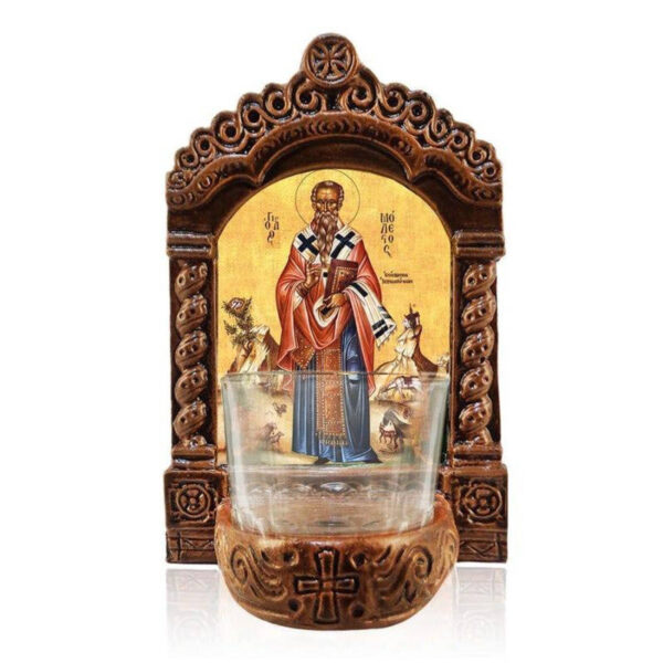 Εικόνα Ορθοδοξίας με περίγραμμα χρυσό σε ξύλο Φλαμουρίας με βάση Φωτιστικό Αγρυπνίας Αγίου Μοδέστου, Επιτραπέζια εικόνα του Αγίου Μόδεστου, Ελληνικής κατασκευής Επιτραπέζιο Φωτιστικό, Χειροποίητο Κεραμικό Φωτιστικό με Γυάλινο Κύπελλο Διάσταση 45×35 cm (17,7 x 13,8 ίντσες) INTRAEK-543216723879