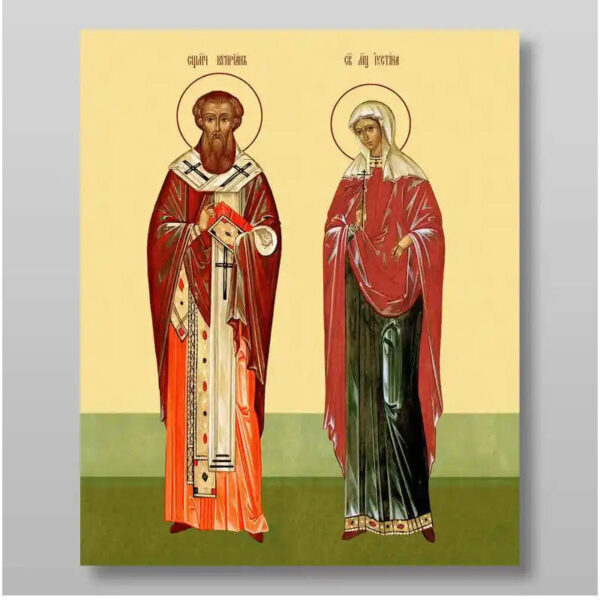 Εικόνα Ορθοδοξίας με περίγραμμα χρυσό σε ξύλο Φλαμουρίας με βάση Κύπρια και Ιουστινία μάρτυρες, Χειροποίητη Ελληνορθόδοξη , Κρεμαστή πλάκα βυζαντινής τέχνης, χριστιανική τέχνη Διάσταση 15×11 cm (5,9 x 4,3 ίντσες) INTRAEK-21319