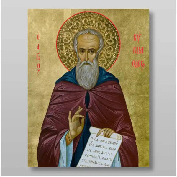Εικόνα Ορθοδοξίας με περίγραμμα χρυσό σε ξύλο Φλαμουρίας με βάση Kuksha Odessky Reverend, Χειροποίητη Ελληνορθόδοξη , Κρεμαστή πλάκα βυζαντινής τέχνης, χριστιανική τέχνη Διάσταση 15×11 cm (5,9 x 4,3 ίντσες) INTRAEK-21290