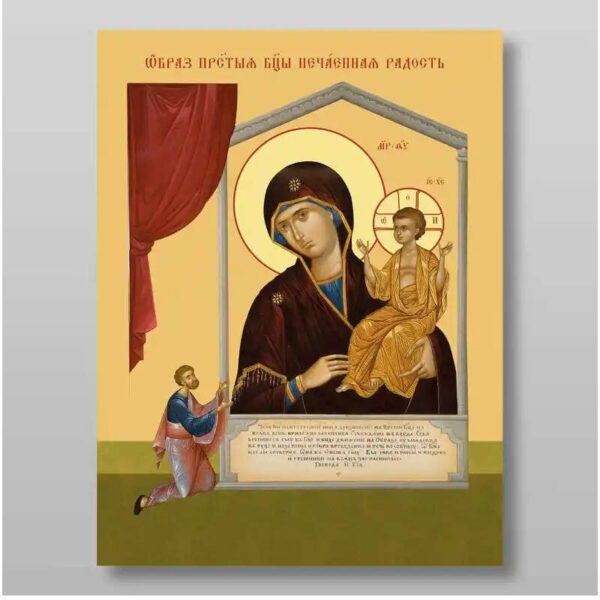 Εικόνα Ορθοδοξίας με περίγραμμα χρυσό σε ξύλο Φλαμουρίας με βάση Απροσδόκητη Χαρά Εικονίδιο της Μητέρας του Θεού Χειροποίητη Ελληνορθόδοξη , Κρεμαστή πλάκα βυζαντινής τέχνης, χριστιανική τέχνη Διάσταση 15×11 cm (5,9 x 4,3 ίντσες) INTRAEK-21221