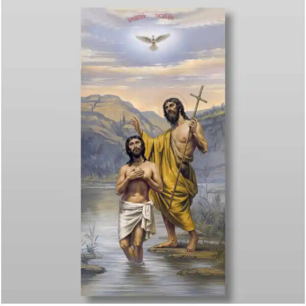 Εικόνα Ορθοδοξίας με περίγραμμα χρυσό σε ξύλο Φλαμουρίας με βάση Η Βάπτιση του Ιησού Χριστού στον Ιορδάνη ποταμό, Χειροποίητη Ελληνορθόδοξη , Κρεμαστή πλάκα βυζαντινής τέχνης, χριστιανική τέχνη Διάσταση 15×11 cm (5,9 x 4,3 ίντσες) INTRAEK-21150