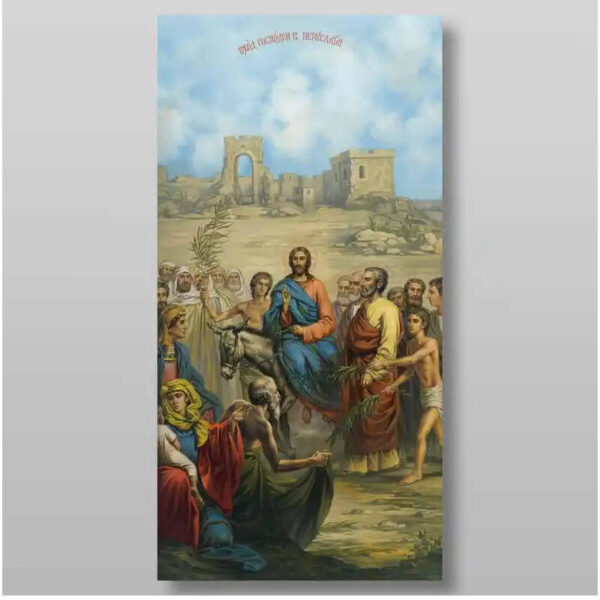 Εικόνα Ορθοδοξίας με περίγραμμα χρυσό σε ξύλο Φλαμουρίας με βάση Είσοδος του Κυρίου στην Ιερουσαλήμ, Χειροποίητη Ελληνορθόδοξη , Κρεμαστή πλάκα βυζαντινής τέχνης, χριστιανική τέχνη Διάσταση 15×11 cm (5,9 x 4,3 ίντσες) INTRAEK-21132