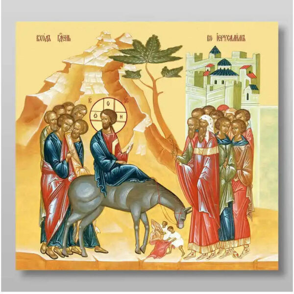 Εικόνα Ορθοδοξίας με περίγραμμα χρυσό σε ξύλο Φλαμουρίας με βάση Είσοδος του Κυρίου στην Ιερουσαλήμ, Χειροποίητη Ελληνορθόδοξη , Κρεμαστή πλάκα βυζαντινής τέχνης, χριστιανική τέχνη Διάσταση 15×11 cm (5,9 x 4,3 ίντσες) INTRAEK-21130