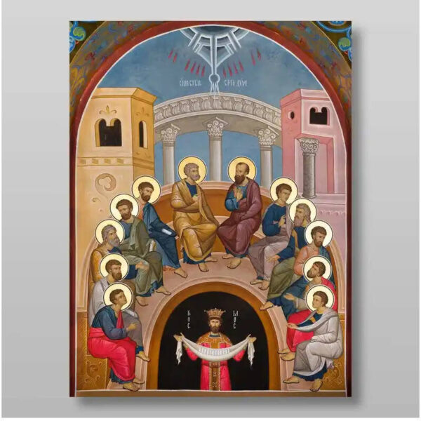 Εικόνα Ορθοδοξίας με περίγραμμα χρυσό σε ξύλο Φλαμουρίας με βάση Κάθοδος του Αγίου Πνεύματος της Πεντηκοστής Χειροποίητη Ελληνορθόδοξη , Κρεμαστή πλάκα βυζαντινής τέχνης, χριστιανική τέχνη Διάσταση 15×11 cm (5,9 x 4,3 ίντσες) INTRAEK-21078