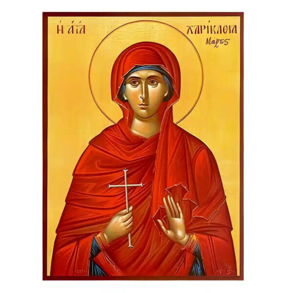Βασικά Χαρακτηριστικά: – Σχέδιο: Κλασική βυζαντινή εικονογραφία με ζωηρό κόκκινο περίγραμμα – Υλικό: Ξύλο Μασίφ Φλαμουρία υψηλής αντοχής με προστατευτικό βερνίκι για ποιότητα που διαρκεί – Προέλευση: Χειροποίητο στην Ελλάδα – Σκοπός: Ιδανικό για γωνιές προσευχής, εκκλησίες, διακόσμηση σπιτιού ή ως δώρο με νόημα Διαθέσιμα μεγέθη: 10×7 cm (3,9 x 2,8 ίντσες) 15×11 cm (5,9 x 4,3 ίντσες) 21×15 cm (8,3 x 5,9 ίντσες) 26×20 cm (10,2 x 7,9 ίντσες) 40×30 cm (15,8 x 11,8 ίντσες) 45×35 cm (17,7 x 13,8 ίντσες) 50×40 cm (19,7 x 15,8 ίντσες)► Εικόνα της Αγίας Χαρίκλειας, ξύλινη. Χειροποίητη ξύλινη εικόνα, ειδικής επεξεργασίας σε σκληρό Φλαμουριά Ξύλο Εικόνα Ορθόδοξης τέχνης, σκαλισμένη ή τυπωμένη σε ξύλο φλαμουριάς υψηλής ποιότητας. Η φυσική απαλότητα και ομοιομορφία του ξύλου τονίζει κάθε λεπτομέρεια του εικονίσματος, αναδεικνύοντας τη βαθιά πνευματικότητα και την ιερότητα της παράδοσης. Ιδανική για οικιακό εικονοστάσι, δώρο βάπτισης, γάμου ή αφιέρωμα σε ναό. Το ξύλο έχει υποστεί ειδική επεξεργασία για αντοχή και αισθητική αρμονία, κρατώντας ζωντανά τα χρώματα και τη μορφή του προσώπου του Αγίου. με ανεξίτηλα χρώματα σε λεπτό καμβά.
