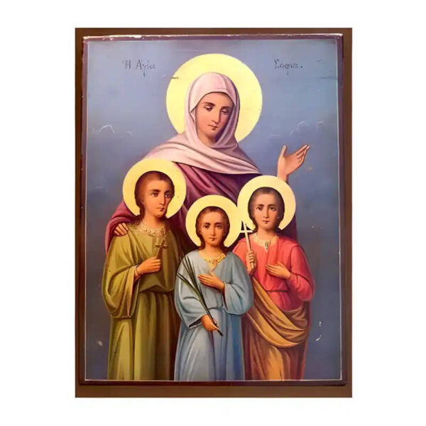 Βασικά Χαρακτηριστικά: – Σχέδιο: Κλασική βυζαντινή εικονογραφία με ζωηρό κόκκινο περίγραμμα – Υλικό: Ξύλο Μασίφ Φλαμουρία υψηλής αντοχής με προστατευτικό βερνίκι για ποιότητα που διαρκεί – Προέλευση: Χειροποίητο στην Ελλάδα – Σκοπός: Ιδανικό για γωνιές προσευχής, εκκλησίες, διακόσμηση σπιτιού ή ως δώρο με νόημα Διαθέσιμα μεγέθη: 10×7 cm (3,9 x 2,8 ίντσες) 15×11 cm (5,9 x 4,3 ίντσες) 21×15 cm (8,3 x 5,9 ίντσες) 26×20 cm (10,2 x 7,9 ίντσες) 40×30 cm (15,8 x 11,8 ίντσες) 45×35 cm (17,7 x 13,8 ίντσες) 50×40 cm (19,7 x 15,8 ίντσες)► Εικόνα της Αγίας Σοφίας και των 3 θυγατέρων της Πίστη, Ελπίδα και Αγάπη, ξύλινη.