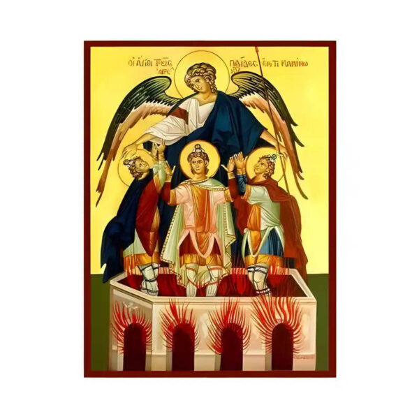 Εικόνα Ορθοδοξίας με περίγραμμα χρυσό σε ξύλο Φλαμουρίας με βάση Εικόνα Άγιοι τρεις Παίδες εν Καμίνω Χειροποίητη Ελληνορθόδοξη , Κρεμαστή πλάκα βυζαντινής τέχνης, χριστιανική τέχνη Διάσταση 45×35 cm (17,7 x 13,8 ίντσες) INTRAEK-6294670441