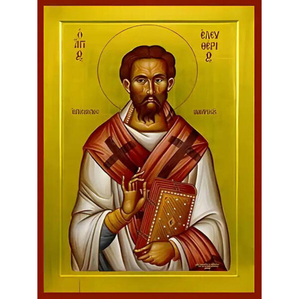 Εικόνα Ορθοδοξίας με περίγραμμα χρυσό σε ξύλο Φλαμουρίας με βάση Εικόνα ΑΓΙΟΣ ΕΛΕΥΘΕΡΙΟΣ, ΙΕΡΟΜΑΡΤΥΣ, ΕΠΙΣΚΟΠΟΣ ΙΛΛΥΡΙΚΟΥ Χειροποίητη Ελληνορθόδοξη εικόνα του Ιησού Χριστού, Κρεμαστή πλάκα βυζαντινής τέχνης, χριστιανική τέχνη Διάσταση 15×11 cm (5,9×4,3 ίντσες) INTRAEK-337757864887