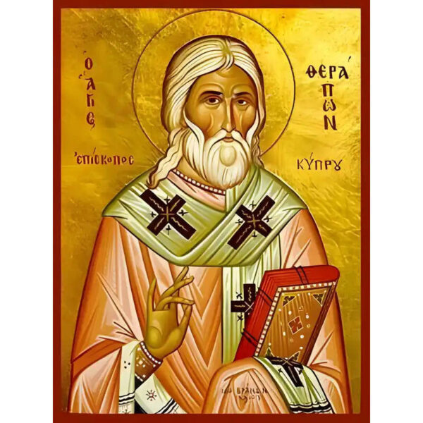 Εικόνα Ορθοδοξίας με περίγραμμα χρυσό σε ξύλο Φλαμουρίας με βάση Εικόνα ΑΓΙΟΣ ΘΕΡΑΠΩΝ, ΕΠΙΣΚΟΠΟΣ ΚΥΠΡΟΥ Χειροποίητη Ελληνορθόδοξη εικόνα του Ιησού Χριστού, Κρεμαστή πλάκα βυζαντινής τέχνης, χριστιανική τέχνη Διάσταση 15×11 cm (5,9×4,3 ίντσες) INTRAEK-337757864844