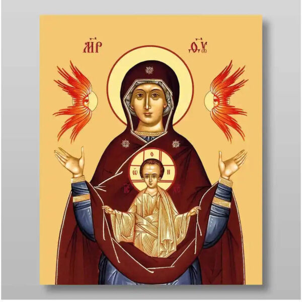 Εικόνα Ορθοδοξίας με περίγραμμα χρυσό σε ξύλο Φλαμουρίας με βάση Εικόνα της Μητέρας του Θεού, του Σημαδίου Χειροποίητη Ελληνορθόδοξη , Κρεμαστή πλάκα βυζαντινής τέχνης, χριστιανική τέχνη Διάσταση 50×40 cm (19,7 x 15,8 ίντσες) INTRAEK-65432768