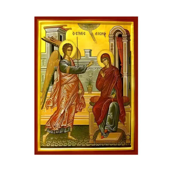 Βασικά Χαρακτηριστικά: – Σχέδιο: Κλασική βυζαντινή εικονογραφία με ζωηρό κόκκινο περίγραμμα – Υλικό: Ξύλο Μασίφ Φλαμουρία υψηλής αντοχής με προστατευτικό βερνίκι για ποιότητα που διαρκεί – Προέλευση: Χειροποίητο στην Ελλάδα – Σκοπός: Ιδανικό για γωνιές προσευχής, εκκλησίες, διακόσμηση σπιτιού ή ως δώρο με νόημα Διαθέσιμα μεγέθη: 10×7 cm (3,9 x 2,8 ίντσες) 15×11 cm (5,9 x 4,3 ίντσες) 21×15 cm (8,3 x 5,9 ίντσες) 26×20 cm (10,2 x 7,9 ίντσες) 40×30 cm (15,8 x 11,8 ίντσες) 45×35 cm (17,7 x 13,8 ίντσες) 50×40 cm (19,7 x 15,8 ίντσες)► Εικόνα του Ευαγγελισμού της Θεοτόκου