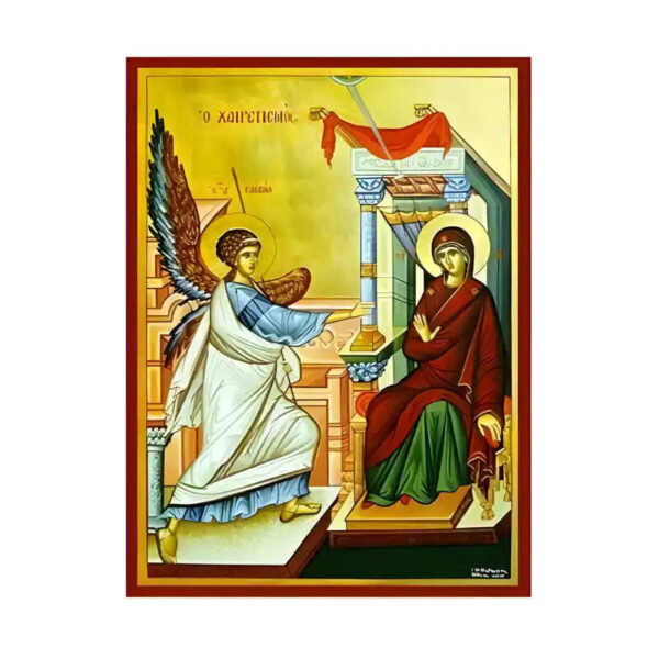 Βασικά Χαρακτηριστικά: – Σχέδιο: Κλασική βυζαντινή εικονογραφία με ζωηρό κόκκινο περίγραμμα – Υλικό: Ξύλο Μασίφ Φλαμουρία υψηλής αντοχής με προστατευτικό βερνίκι για ποιότητα που διαρκεί – Προέλευση: Χειροποίητο στην Ελλάδα – Σκοπός: Ιδανικό για γωνιές προσευχής, εκκλησίες, διακόσμηση σπιτιού ή ως δώρο με νόημα Διαθέσιμα μεγέθη: 10×7 cm (3,9 x 2,8 ίντσες) 15×11 cm (5,9 x 4,3 ίντσες) 21×15 cm (8,3 x 5,9 ίντσες) 26×20 cm (10,2 x 7,9 ίντσες) 40×30 cm (15,8 x 11,8 ίντσες) 45×35 cm (17,7 x 13,8 ίντσες) 50×40 cm (19,7 x 15,8 ίντσες)► Εικόνα του Ευαγγελισμού της Θεοτόκου