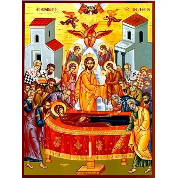 Εικόνα Ορθοδοξίας με περίγραμμα χρυσό σε ξύλο Φλαμουρίας με βάση Εικόνα Κοίμησις της Θεοτόκου Χειροποίητη Ελληνορθόδοξη , Κρεμαστή πλάκα βυζαντινής τέχνης, χριστιανική τέχνη Διάσταση 10×7 cm (3,9 x 2,8 ίντσες) INTRAEK-671336