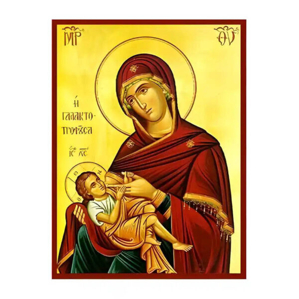 Βασικά Χαρακτηριστικά: – Σχέδιο: Κλασική βυζαντινή εικονογραφία με ζωηρό κόκκινο περίγραμμα – Υλικό: Ξύλο Μασίφ Φλαμουρία υψηλής αντοχής με προστατευτικό βερνίκι για ποιότητα που διαρκεί – Προέλευση: Χειροποίητο στην Ελλάδα – Σκοπός: Ιδανικό για γωνιές προσευχής, εκκλησίες, διακόσμηση σπιτιού ή ως δώρο με νόημα Διαθέσιμα μεγέθη: 10×7 cm (3,9 x 2,8 ίντσες) 15×11 cm (5,9 x 4,3 ίντσες) 21×15 cm (8,3 x 5,9 ίντσες) 26×20 cm (10,2 x 7,9 ίντσες) 40×30 cm (15,8 x 11,8 ίντσες) 45×35 cm (17,7 x 13,8 ίντσες) 50×40 cm (19,7 x 15,8 ίντσες)► Εικόνα της Παναγίας της Γαλακτοτροφούσας, ξύλινη. Χειροποίητη ξύλινη εικόνα, ειδικής επεξεργασίας σε σκληρό Φλαμουριά Ξύλο Εικόνα Ορθόδοξης τέχνης, σκαλισμένη ή τυπωμένη σε ξύλο φλαμουριάς υψηλής ποιότητας. Η φυσική απαλότητα και ομοιομορφία του ξύλου τονίζει κάθε λεπτομέρεια του εικονίσματος, αναδεικνύοντας τη βαθιά πνευματικότητα και την ιερότητα της παράδοσης. Ιδανική για οικιακό εικονοστάσι, δώρο βάπτισης, γάμου ή αφιέρωμα σε ναό. Το ξύλο έχει υποστεί ειδική επεξεργασία για αντοχή και αισθητική αρμονία, κρατώντας ζωντανά τα χρώματα και τη μορφή του προσώπου του Αγίου. με ανεξίτηλα χρώματα σε λεπτό καμβά.
