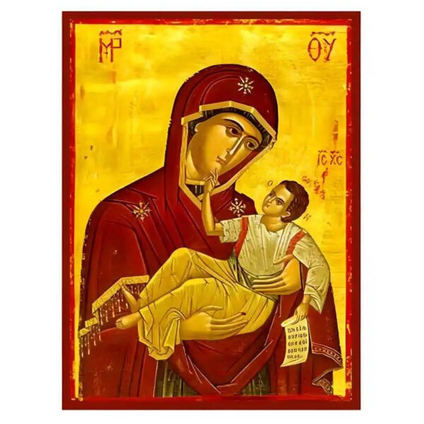 Βασικά Χαρακτηριστικά: – Σχέδιο: Κλασική βυζαντινή εικονογραφία με ζωηρό κόκκινο περίγραμμα – Υλικό: Ξύλο Μασίφ Φλαμουρία υψηλής αντοχής με προστατευτικό βερνίκι για ποιότητα που διαρκεί – Προέλευση: Χειροποίητο στην Ελλάδα – Σκοπός: Ιδανικό για γωνιές προσευχής, εκκλησίες, διακόσμηση σπιτιού ή ως δώρο με νόημα Διαθέσιμα μεγέθη: 10×7 cm (3,9 x 2,8 ίντσες) 15×11 cm (5,9 x 4,3 ίντσες) 21×15 cm (8,3 x 5,9 ίντσες) 26×20 cm (10,2 x 7,9 ίντσες) 40×30 cm (15,8 x 11,8 ίντσες) 45×35 cm (17,7 x 13,8 ίντσες) 50×40 cm (19,7 x 15,8 ίντσες)► Εικόνα της Παναγίας με τον Χριστό