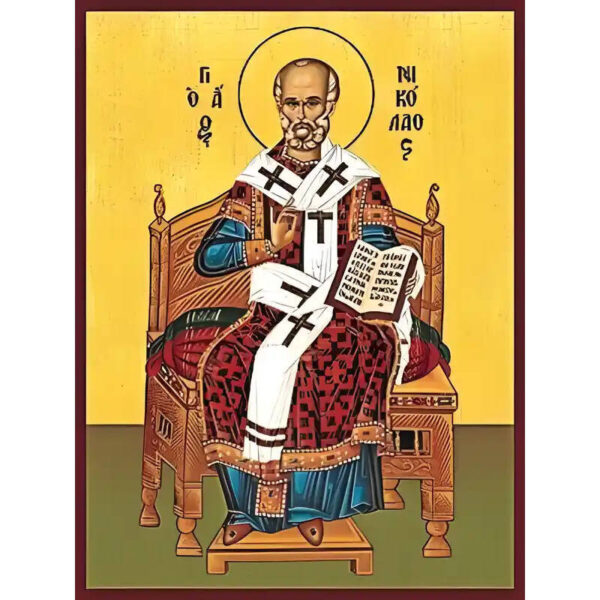 Εικόνα Ορθοδοξίας με περίγραμμα χρυσό σε ξύλο Φλαμουρίας με βάση Εικόνα ΑΓΙΟΣ ΝΙΚΟΛΑΟΣ, ΑΡΧΙΕΠΙΣΚΟΠΟΣ ΜΥΡΩΝ ΛΥΚΙΑΣ, ΕΝΘΡΟΝΟΣ Χειροποίητη Ελληνορθόδοξη εικόνα του Ιησού Χριστού, Κρεμαστή πλάκα βυζαντινής τέχνης, χριστιανική τέχνη Διάσταση 15×11 cm (5,9×4,3 ίντσες) INTRAEK-337757864671
