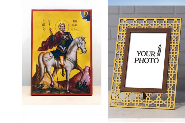 Εικόνα Ορθοδοξίας Πολυτελείας με σχεδιο Σταυρούς μαζι με Βάση σε 8 χρώματα με περίγραμμα χρυσό σε ξύλο Plywood (Πλακάζ) με βάση Άγιος Μηνάς της Αιγύπτου έφιππος, Ξύλινη Χειροποίητη Εικόνα Ελληνικής Premium Βυζαντινής τεχνοτροπίας Κρεμασμένη σε ξύλινη πλάκα Χειροποίητη Ελληνορθόδοξη εικόνα του Ιησού Χριστού, Κρεμαστή πλάκα βυζαντινής τέχνης, χριστιανική τέχνη Διάσταση 10×7 cm (3,9 x 2,8 ίντσες) INTRAEK3kadro3211-11025