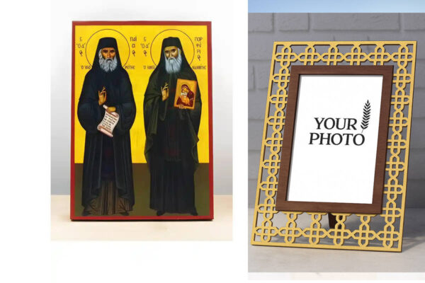 Εικόνα Ορθοδοξίας Πολυτελείας με σχεδιο Σταυρούς μαζι με Βάση σε 8 χρώματα με περίγραμμα χρυσό σε ξύλο Plywood (Πλακάζ) με βάση Άγιοι Παΐσιος του Αγίου Όρους & Πορφύριος Καυσοκαλυβίων, Ξύλινη Χειροποίητη Εικόνα Ελληνικής Βυζαντινής Στυλ Κρεμαστή σε ξύλινη πλάκα Χειροποίητη Ελληνορθόδοξη εικόνα του Ιησού Χριστού, Κρεμαστή πλάκα βυζαντινής τέχνης, χριστιανική τέχνη Διάσταση 10×7 cm (3,9 x 2,8 ίντσες) INTRAEK3kadro3211-10813