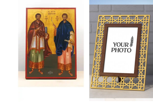 Εικόνα Ορθοδοξίας Πολυτελείας με σχεδιο Σταυρούς μαζι με Βάση σε 8 χρώματα με περίγραμμα χρυσό σε ξύλο Plywood (Πλακάζ) με βάση Άγιοι Άγιοι Ανεργοφόροι Κοσμάς και Δαμιανός, Ξύλινη Χειροποίητη Εικόνα Ελληνικού Βυζαντινού Στυλ Κρεμαστό σε ξύλινη πλάκα Χειροποίητη Ελληνορθόδοξη εικόνα του Ιησού Χριστού, Κρεμαστή πλάκα βυζαντινής τέχνης, χριστιανική τέχνη Διάσταση 15×11 cm (5,9 x 4,3 ίντσες) INTRAEK3kadro3211-611029