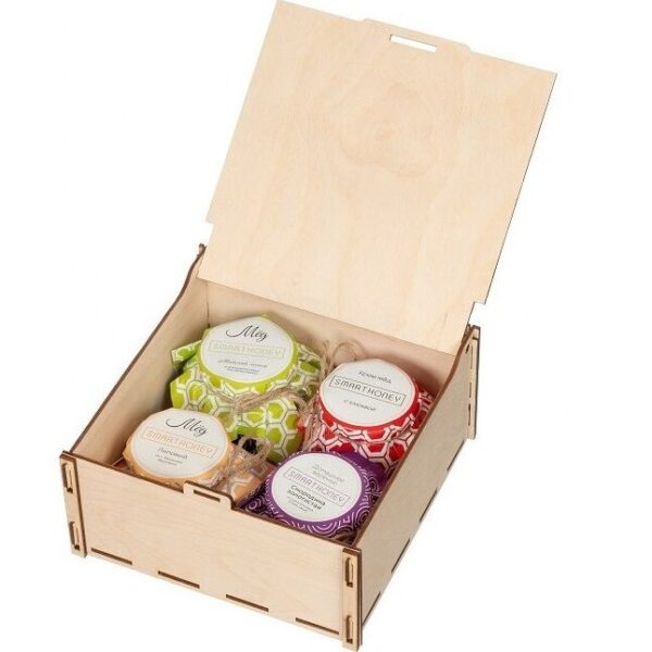 Intra απο ξύλο plywood 3mm-4mm πάχος – Ξύλινο κουτί συσκευασίας για 4 βάζα μελιού Λίμα 40×40 cm INTRAVECTRY-MY557060