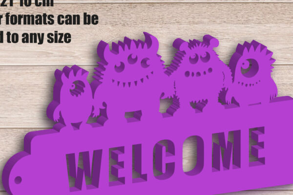 Intra απο ξύλο plywood Χρώμα wenge 3mm-4mm πάχος – Οικογενειακό σημάδι καλωσορίσματος, Monsters Δίασταση 30×20 cm INTRAFABR-71630030