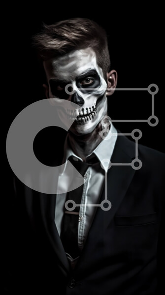 Intra Συλλεκτικό Ξύλινο Παζλ Plywood 4mm – Άνδρας με βαμμένο κρανίο πρόσωπο με μαύρο κοστούμι και γραβάτα που στέκεται σε μαύρο φόντο Σε Ξύλινο Κουτί – Διαστάσεις Puzzle: 10×10 cm – 25 κομμάτια
