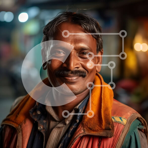 Intra Συλλεκτικό Ξύλινο Παζλ Plywood 4mm – Άνδρας με κόκκινο γιλέκο και μουστάκι που χαμογελά στη φωτογραφική μηχανή σε αμυδρά φωτισμένη οδό τη νύχτα Σε Ξύλινο Κουτί – Διαστάσεις Puzzle: 10×10 cm – 25 κομμάτια