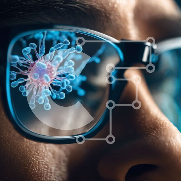 Intra Συλλεκτικό Ξύλινο Παζλ Plywood 4mm – Άνδρας που φοράει γυαλιά με διακόσμηση ιού μπλε κυττάρων Σε Ξύλινο Κουτί – Διαστάσεις Puzzle: 10×10 cm – 25 κομμάτια