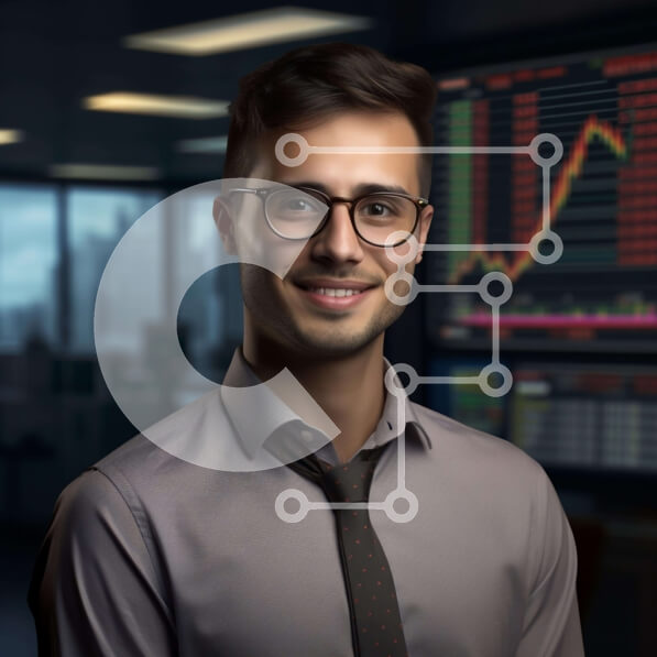 Intra Συλλεκτικό Ξύλινο Παζλ Plywood 4mm – Άνδρας στο γραφείο με οθόνες δεδομένων χρηματιστηρίου και επαγγελματικές κάρτες Σε Ξύλινο Κουτί – Διαστάσεις Puzzle: 10×10 cm – 25 κομμάτια
