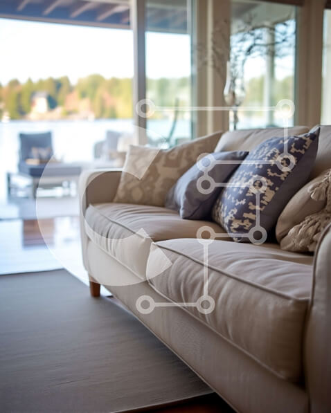 Intra Συλλεκτικό Ξύλινο Παζλ Plywood 4mm – Άνετο σαλόνι με μπεζ καναπέ και θέα στο νερό Σε Ξύλινο Κουτί – Διαστάσεις Puzzle: 10×10 cm – 25 κομμάτια