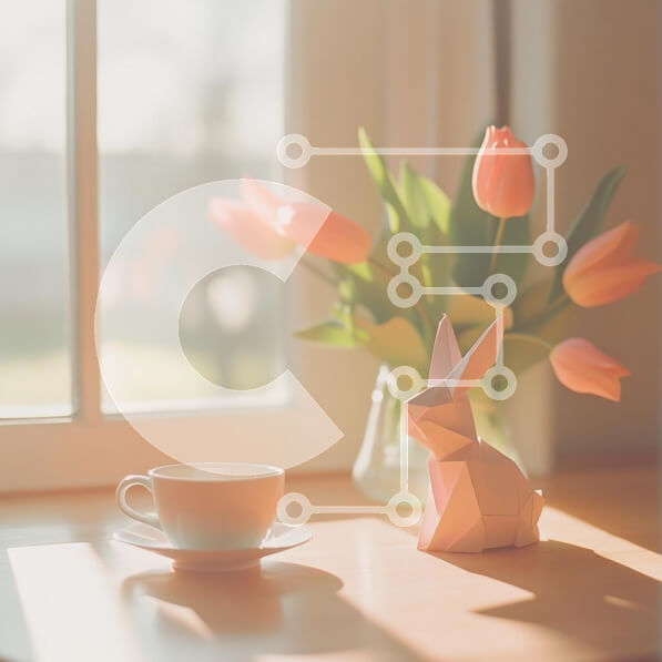 Intra Συλλεκτικό Ξύλινο Παζλ Plywood 4mm – Άνετο σκηνικό εσωτερικού χώρου με τουλίπες και κουνέλι Origami Σε Ξύλινο Κουτί – Διαστάσεις Puzzle: 10×10 cm – 25 κομμάτια