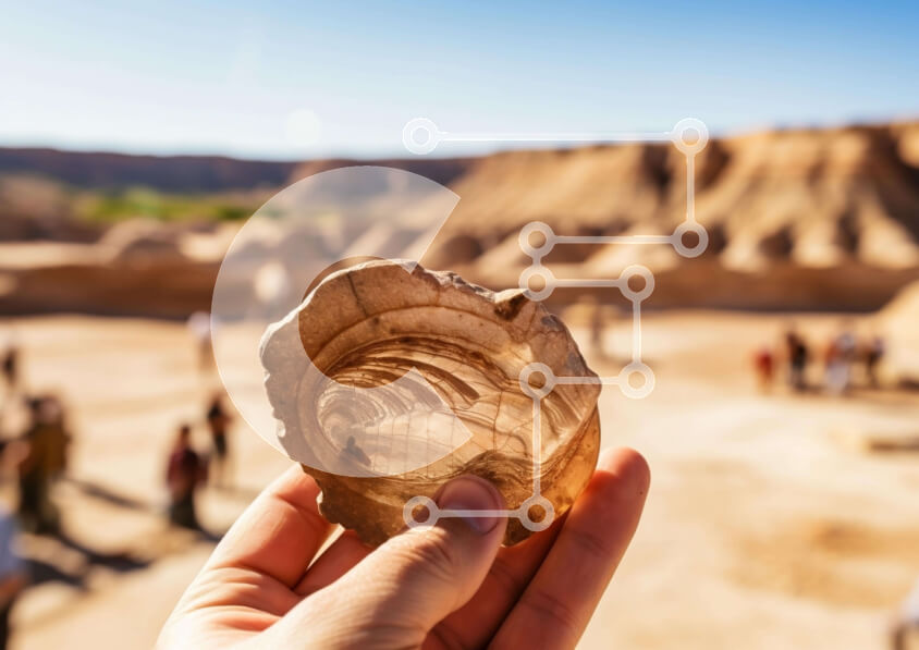 Intra Συλλεκτικό Ξύλινο Παζλ Plywood 4mm – Άτομο που κρατά βράχο ή απολίθωμα που περιβάλλεται από ανθρώπους σε εξωτερικούς χώρους Σε Ξύλινο Κουτί – Διαστάσεις Puzzle: 10×10 cm – 25 κομμάτια