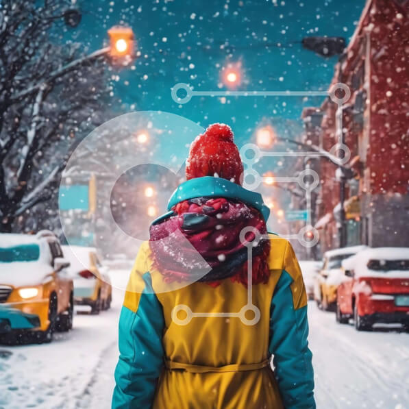Intra Συλλεκτικό Ξύλινο Παζλ Plywood 4mm – Άτομο που περπατά στο χιονισμένο δρόμο τη νύχτα με αυτοκίνητα και λεωφορεία στο παρασκήνιο Σε Ξύλινο Κουτί – Διαστάσεις Puzzle: 10×10 cm – 25 κομμάτια