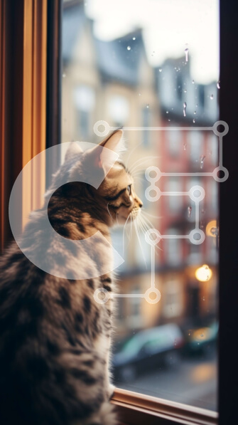 Intra Συλλεκτικό Ξύλινο Παζλ Plywood 4mm – Έντονη γάτα που κοιτάζει έξω από το παράθυρο σε ένα αστικό τοπίο Σε Ξύλινο Κουτί – Διαστάσεις: 10×10 cm – 25 κομμάτια