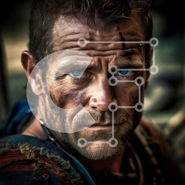 Intra Συλλεκτικό Ξύλινο Παζλ Plywood 4mm – Έντονο πορτρέτο ενός τραχύ άνδρα με διαπεραστικά μπλε μάτια και ένα μεγάλο σπαθί Σε Ξύλινο Κουτί – Διαστάσεις Puzzle: 10×10 cm – 25 κομμάτια