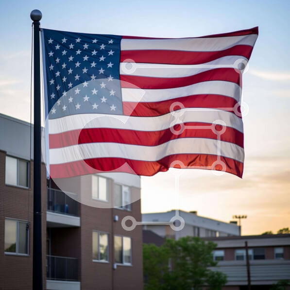 Intra Συλλεκτικό Ξύλινο Παζλ Plywood 4mm – Αμερικανική σημαία κοντά σε πολυκατοικία Σε Ξύλινο Κουτί – Διαστάσεις Puzzle: 10×10 cm – 25 κομμάτια