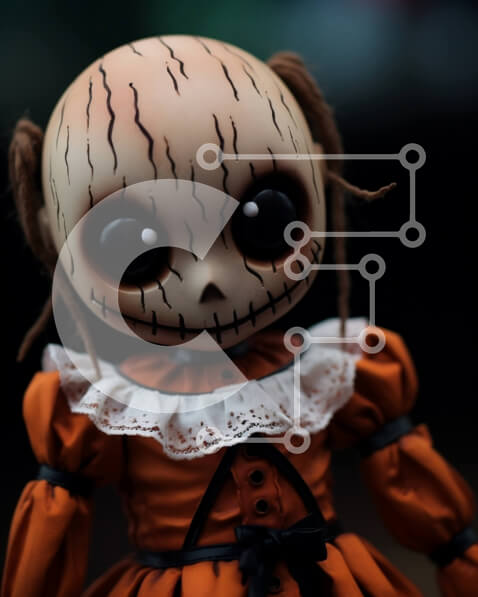 Intra Συλλεκτικό Ξύλινο Παζλ Plywood 4mm – Ανατριχιαστική κούκλα σε πορτοκαλί φόρεμα με ρίγες Σε Ξύλινο Κουτί – Διαστάσεις Puzzle: 10×10 cm – 25 κομμάτια