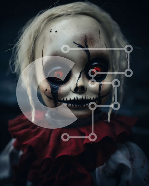 Intra Συλλεκτικό Ξύλινο Παζλ Plywood 4mm – Ανατριχιαστική κούκλα με κόκκινα μάτια για το Halloween Σε Ξύλινο Κουτί – Διαστάσεις Puzzle: 10×10 cm – 25 κομμάτια