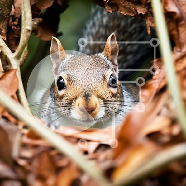 Intra Συλλεκτικό Ξύλινο Παζλ Plywood 4mm – Αξιολάτρευτο κοντινό πλάνο του προσώπου ενός γκρίζου σκίουρου που κρυφοκοιτάζει πίσω από ένα σωρό φύλλα Σε Ξύλινο Κουτί – Διαστάσεις: 10×10 cm – 25 κομμάτια
