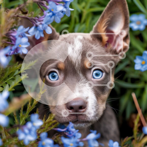 Intra Συλλεκτικό Ξύλινο Παζλ Plywood 4mm – Αξιολάτρευτη εικόνα ενός σκύλου που κρυφοκοιτάζει πίσω από τα μπλε λουλούδια Σε Ξύλινο Κουτί – Διαστάσεις: 10×10 cm – 25 κομμάτια