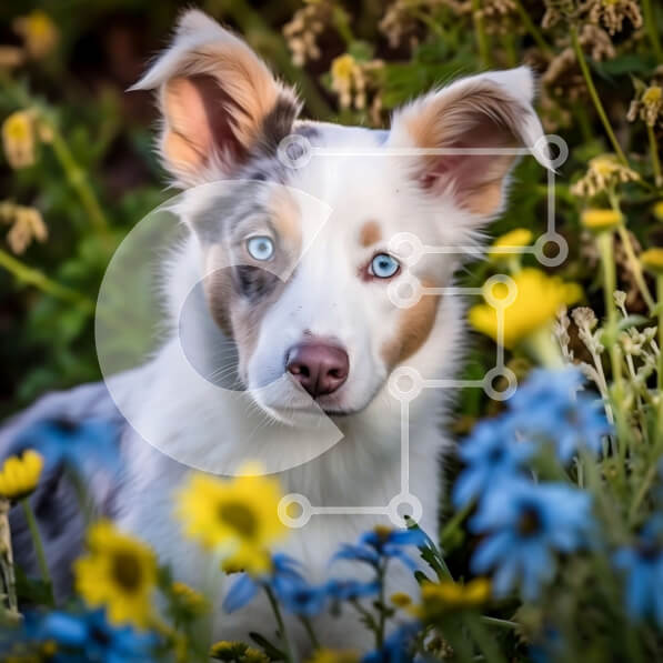 Intra Συλλεκτικό Ξύλινο Παζλ Plywood 4mm – Αξιολάτρευτο σκυλί που κάθεται σε ένα χωράφι με όμορφα κίτρινα και μπλε λουλούδια Σε Ξύλινο Κουτί – Διαστάσεις: 10×10 cm – 25 κομμάτια