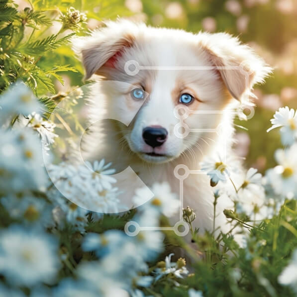 Intra Συλλεκτικό Ξύλινο Παζλ Plywood 4mm – Αξιολάτρευτη εικόνα ενός λευκού και καφέ σκύλου που περιβάλλεται από μαργαρίτες Σε Ξύλινο Κουτί – Διαστάσεις: 10×10 cm – 25 κομμάτια