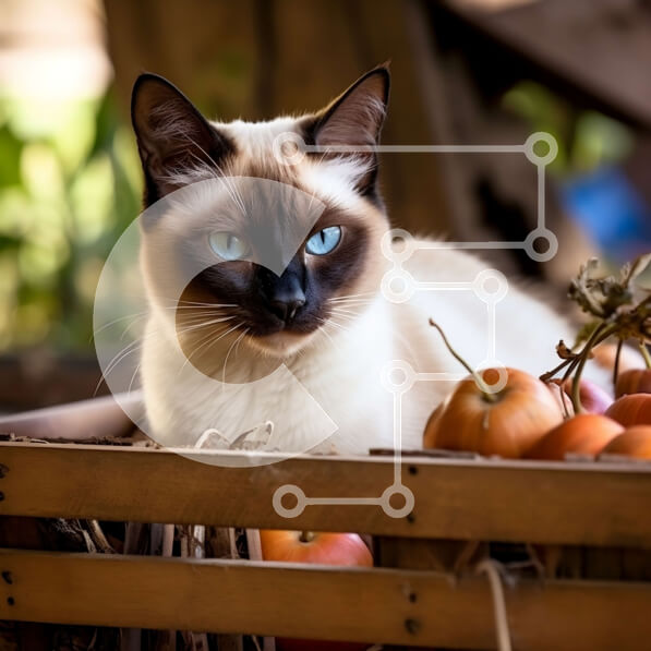Intra Συλλεκτικό Ξύλινο Παζλ Plywood 4mm – Αξιολάτρευτη σιαμαία γάτα σε ξύλινο τελάρο με φρέσκα μήλα Σε Ξύλινο Κουτί – Διαστάσεις: 10×10 cm – 25 κομμάτια