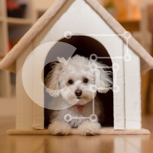 Intra Συλλεκτικό Ξύλινο Παζλ Plywood 4mm – Αξιολάτρευτη εικόνα ενός μικρού λευκού σκύλου που κάθεται σε ένα σκυλόσπιτο Σε Ξύλινο Κουτί – Διαστάσεις: 10×10 cm – 25 κομμάτια