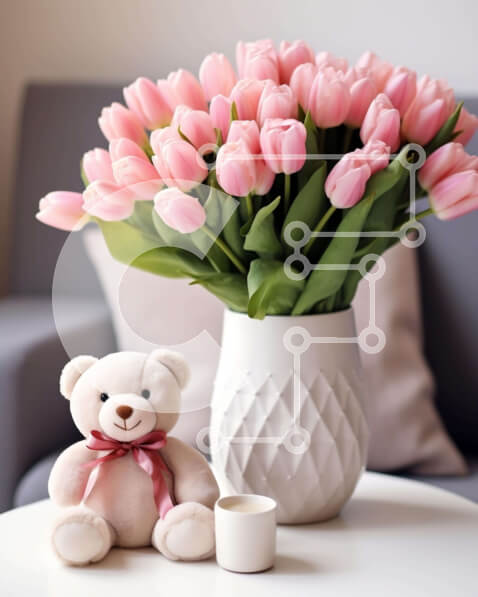 Intra Συλλεκτικό Ξύλινο Παζλ Plywood 4mm – Αρκουδάκι και ροζ τουλίπες στο τραπεζάκι σαλονιού Σε Ξύλινο Κουτί – Διαστάσεις Puzzle: 10×10 cm – 25 κομμάτια