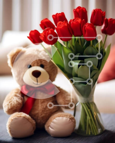 Intra Συλλεκτικό Ξύλινο Παζλ Plywood 4mm – Αρκουδάκι και κόκκινες τουλίπες σε ένα τραπέζι Σε Ξύλινο Κουτί – Διαστάσεις Puzzle: 10×10 cm – 25 κομμάτια