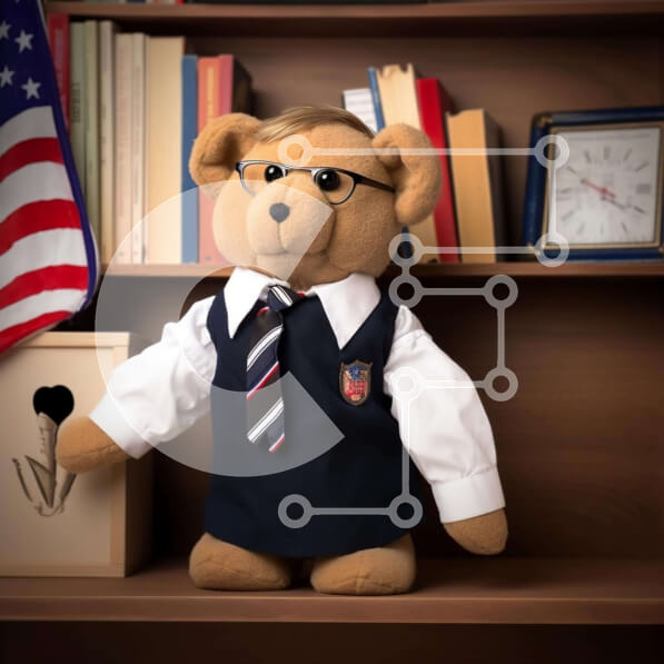 Intra Συλλεκτικό Ξύλινο Παζλ Plywood 4mm – Αρκουδάκι με σχολική στολή σε ράφια με αμερικανική σημαία Σε Ξύλινο Κουτί – Διαστάσεις Puzzle: 10×10 cm – 25 κομμάτια